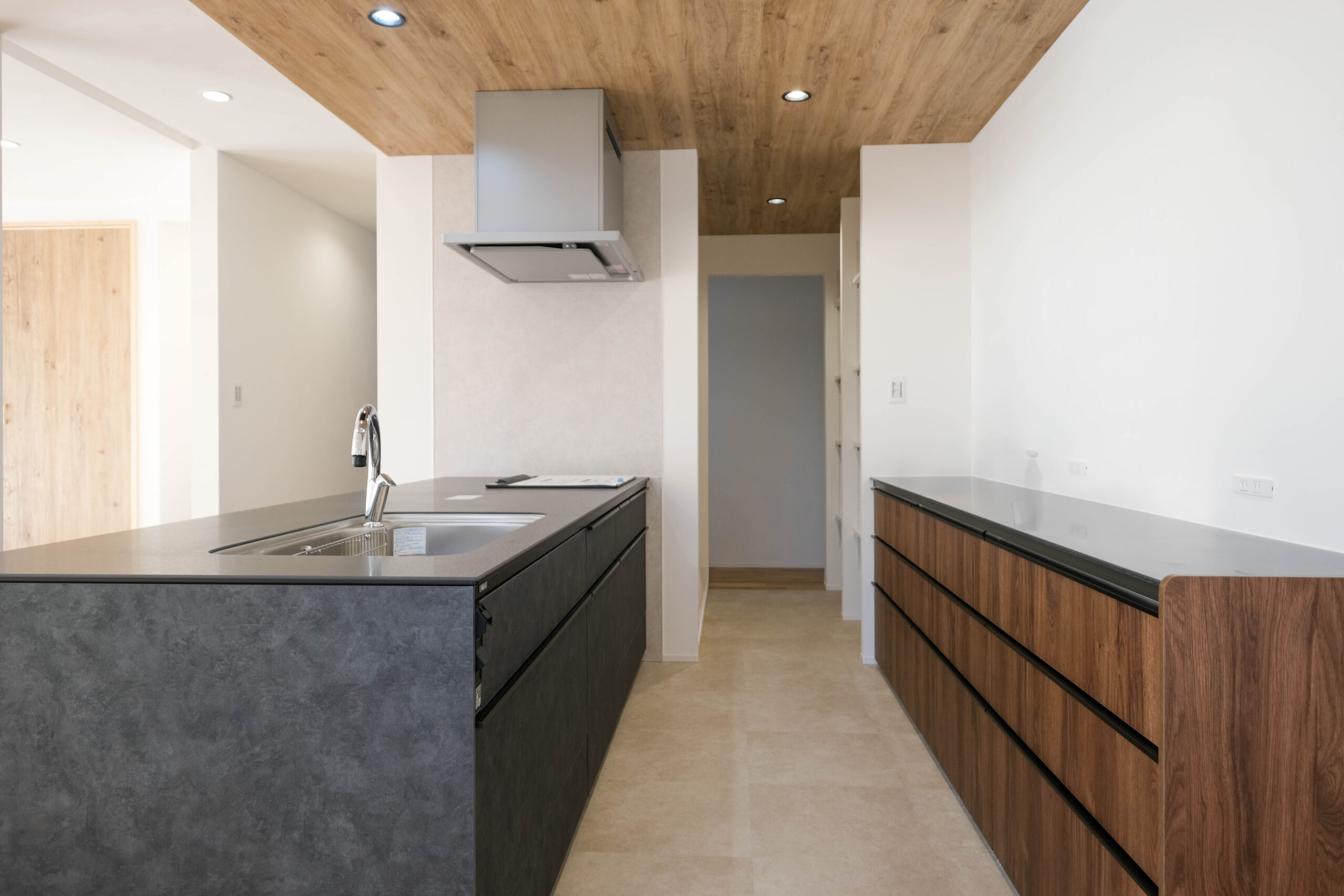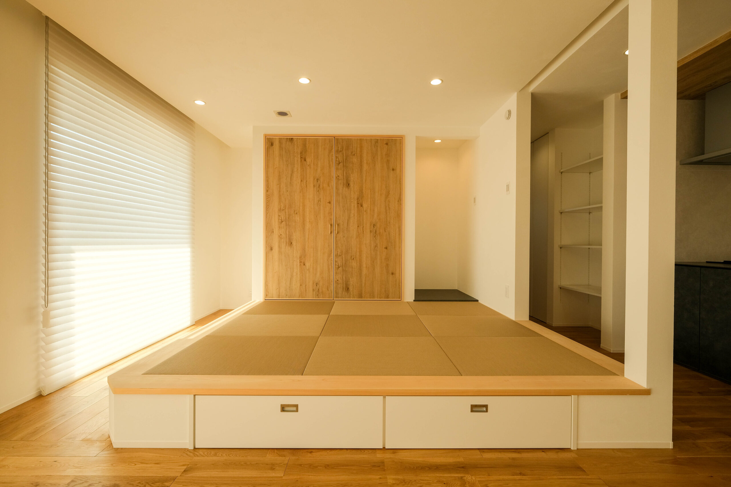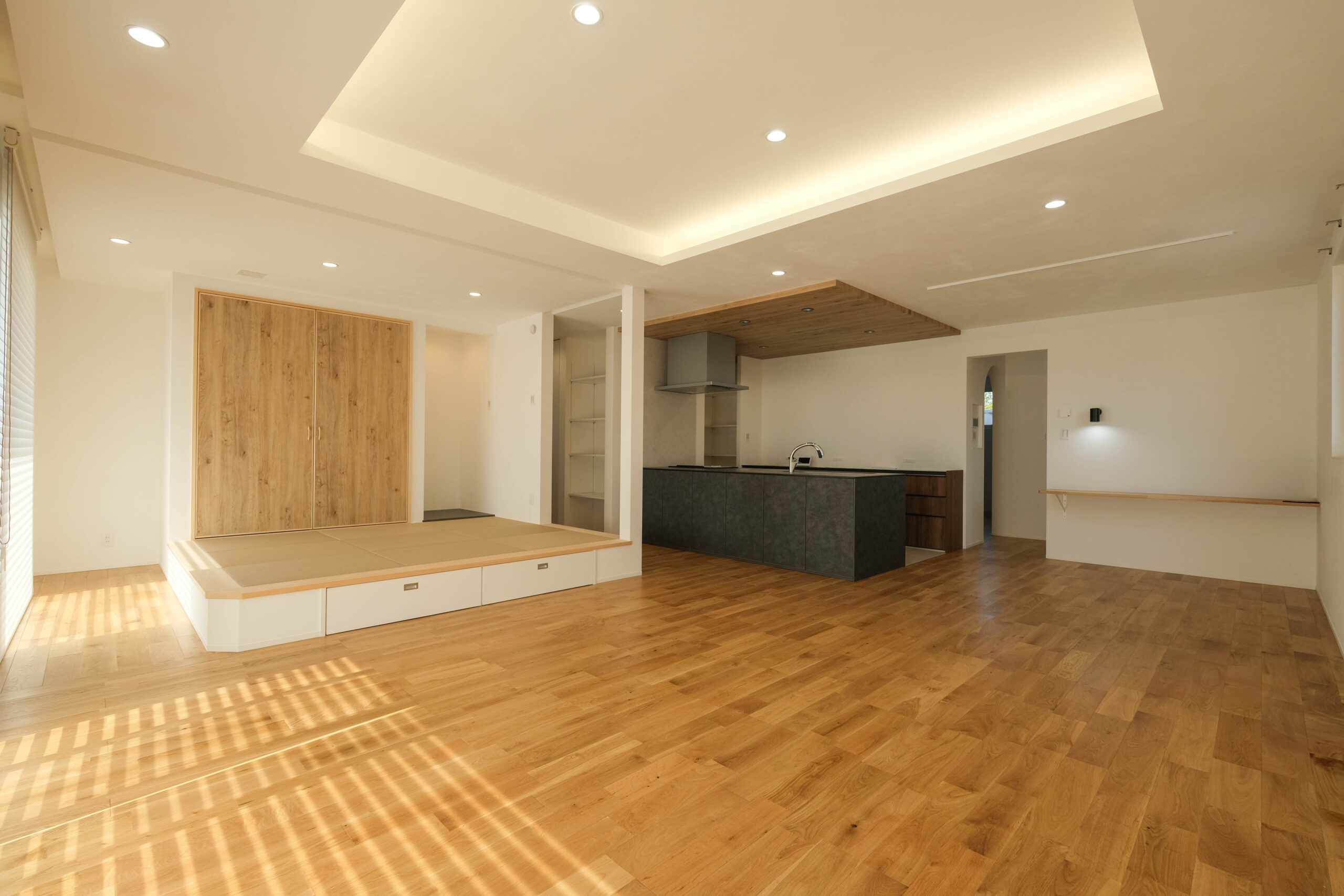 24帖LDK+小上がりタタミスペース/深い軒/帰宅後パントリー+水廻り/間接照明/無垢床/塗り内外壁/外部収納/全館空調,,,etc