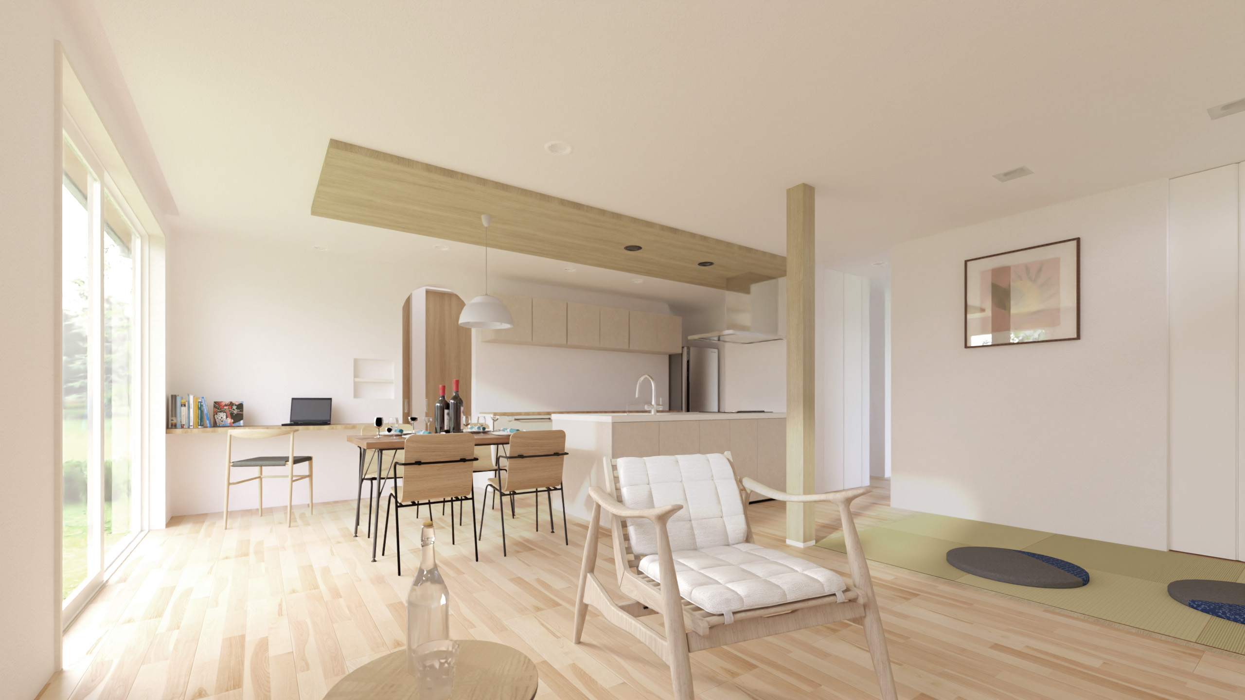 ‐タタミスペースを備えたリビングは、親の目が届く安心の場所。お子様のリビング学習や遊び場として、家族の時間が自然に増える空間です。